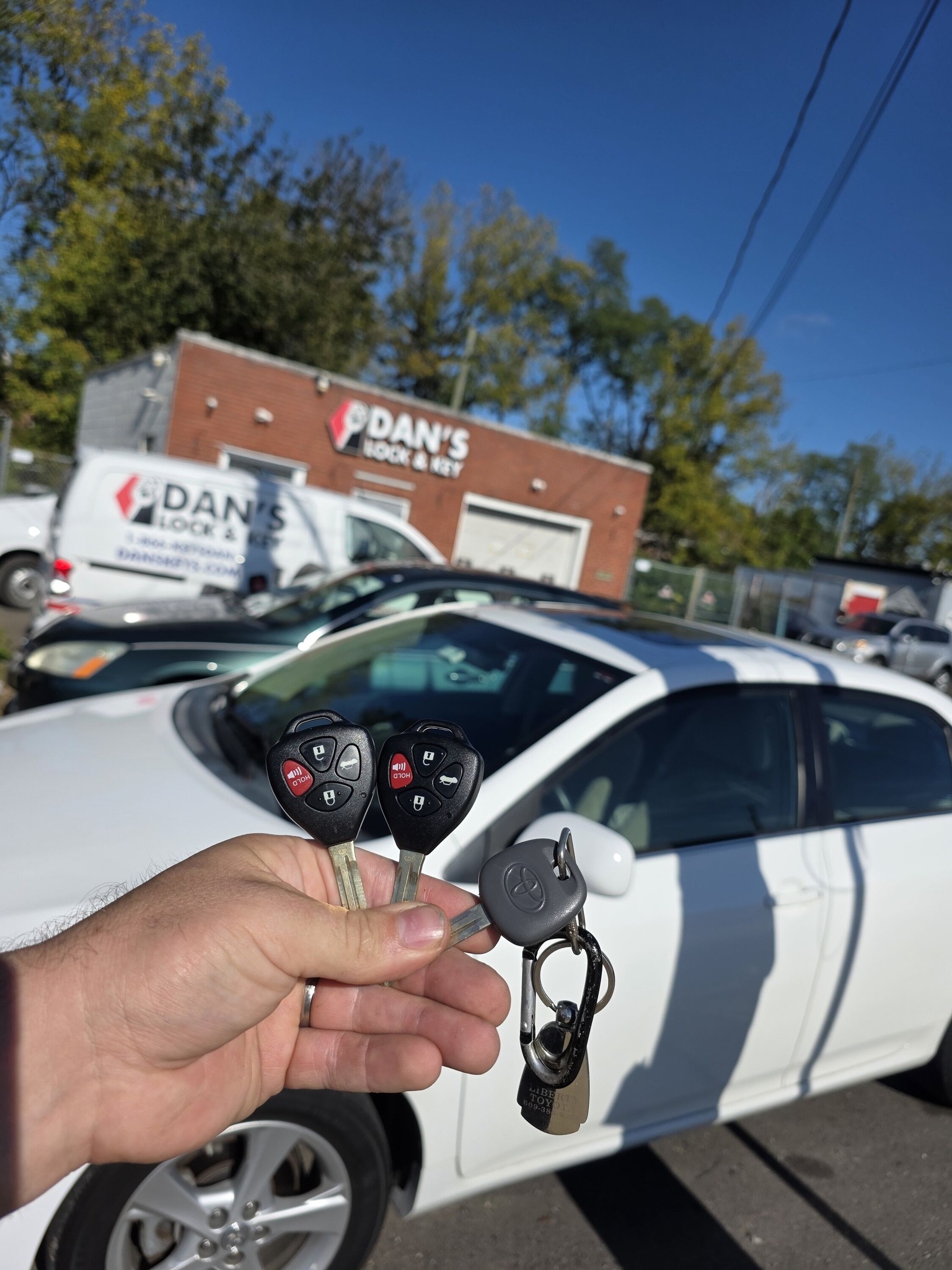 Hand holding three Toyota remote keys and a key fob in front of a white car parked outside Dan's Lock and Key in Bristol, PA, with the company van and building in the background.